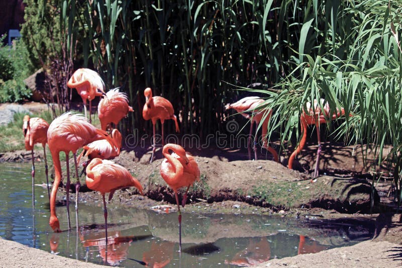 Flamingos in the Pool. Flamingos enjoying the day in the pool