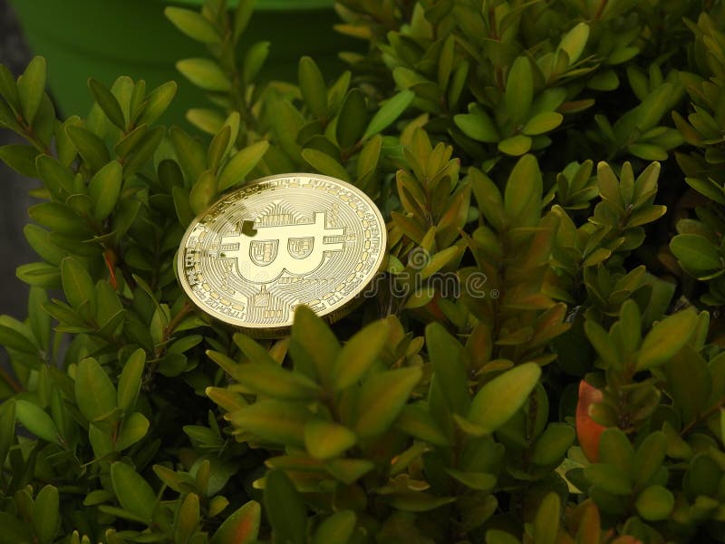 Golden Bitcoin and nature. Golden Bitcoin on green leaves background.