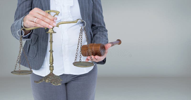 Digital composite of Judge with balance scale and hammer in front of grey background