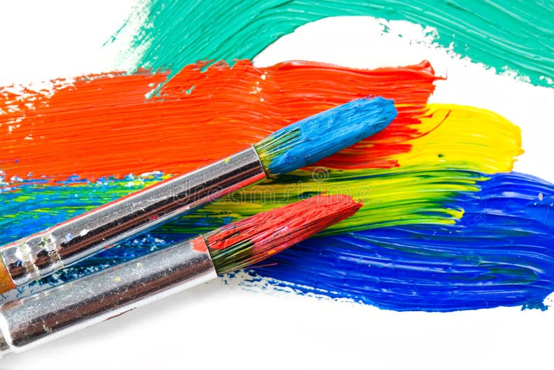 Paints and brushes. Vintage artists brushes and paint tubes on an abstract artistic background