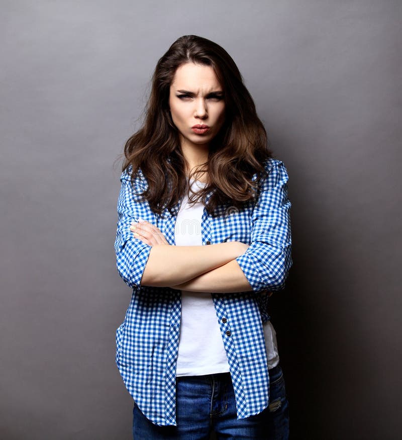 Portrait of angry woman standing with arms folded. Angry woman standing with arms folded on gray background