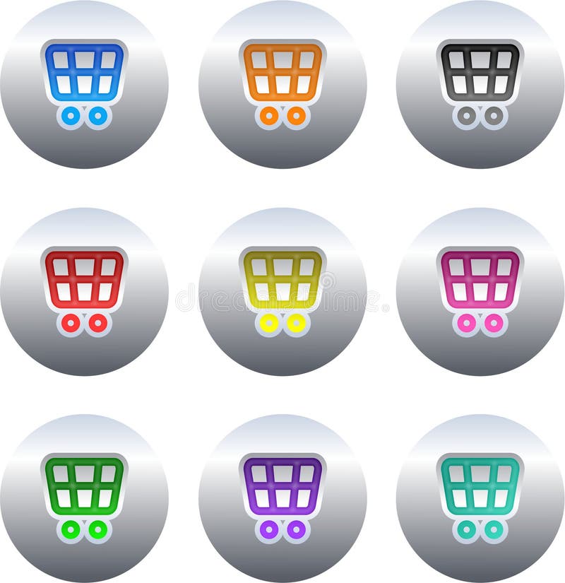 Shopping cart buttons. Collection of colourful gel shopping cart icons set on silver metallic buttons isolated on white