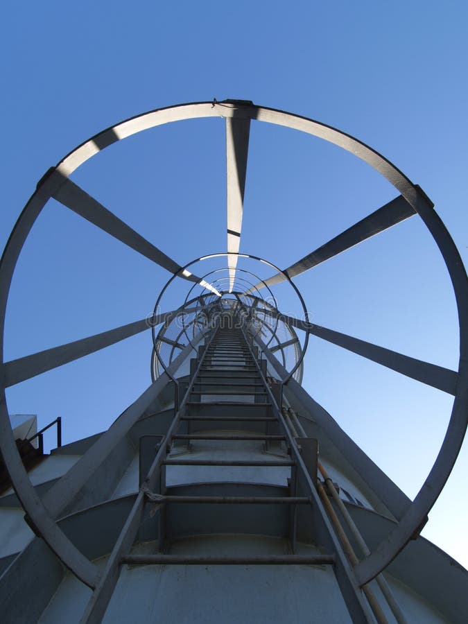 Steep ladder. Vertical ladder with safety rail, leading up a smoke-stack