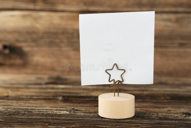 White note paper on a holder on brown wooden background.
