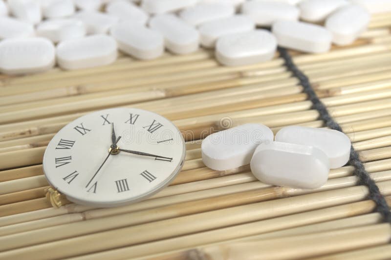 White pill and roman numeric clock on yellow bamboo mat