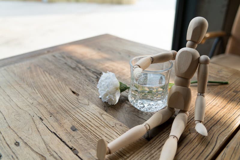 A wood man is sitting and put the arm on the glass of water