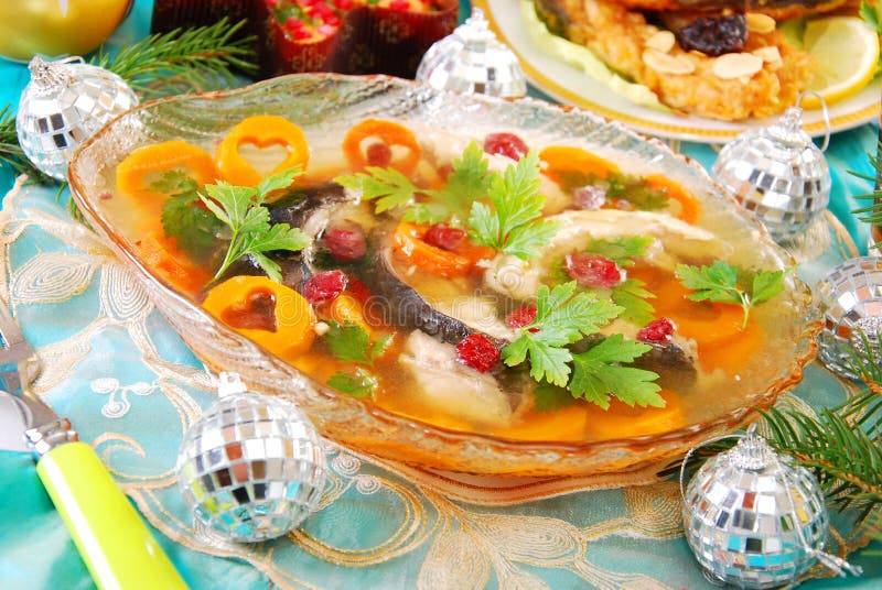 Carp in jelly for christmas. Carp in jelly with carrot and cranberry as traditional polish dish on christmas table