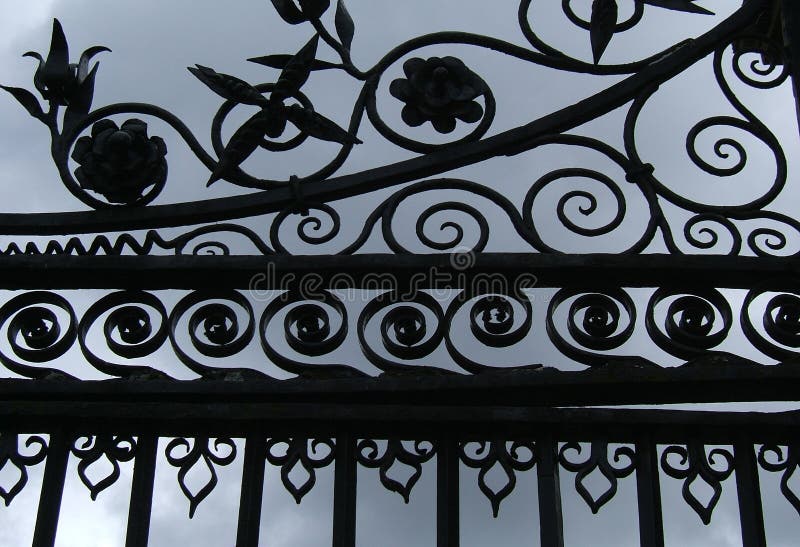 Close-up of castle gates against a stormy sky