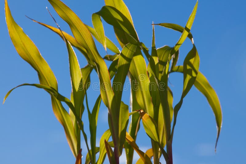 Sunlit young corn plants on an open field at sunset stock image Sunlit young corn plants on an open field at sunset