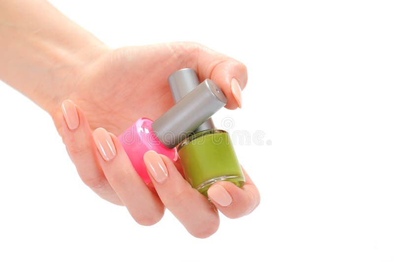 Hand with beige manicure holding two laquer. Hand with perfect beige manicure holding two boxes of nail laquer. white background