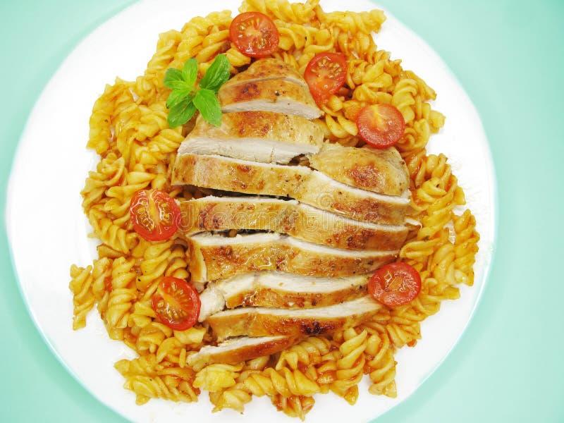 Roast beef meat with vegetables and spaghetti. Chicken roast meat with pasta and tomato