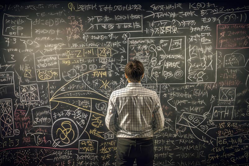 Teacher or university professor writing mathematics calculations on blackboard during class. Back view of male teacher or university professor writing advanced mathematics calculations with white chalk on blackboard during class