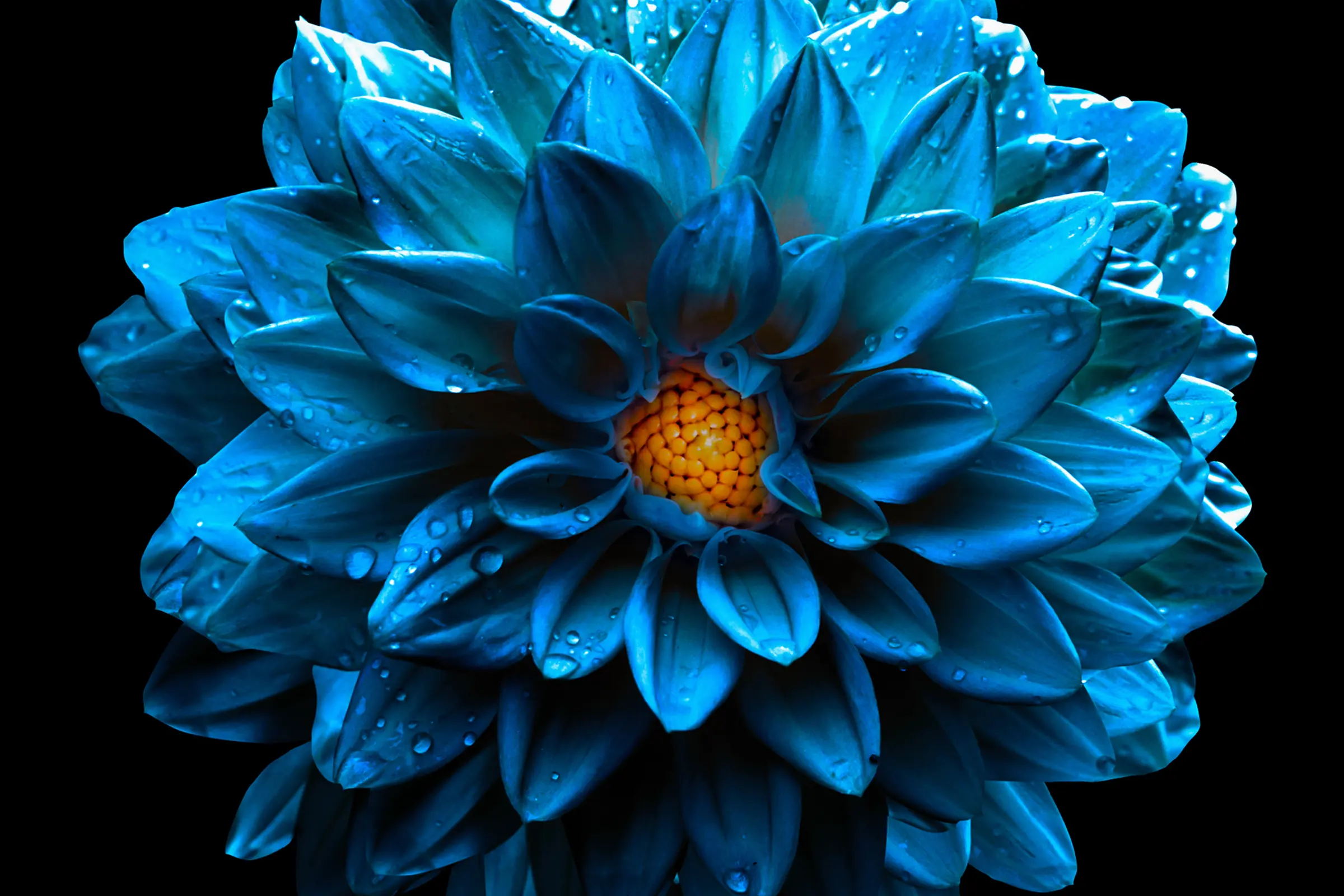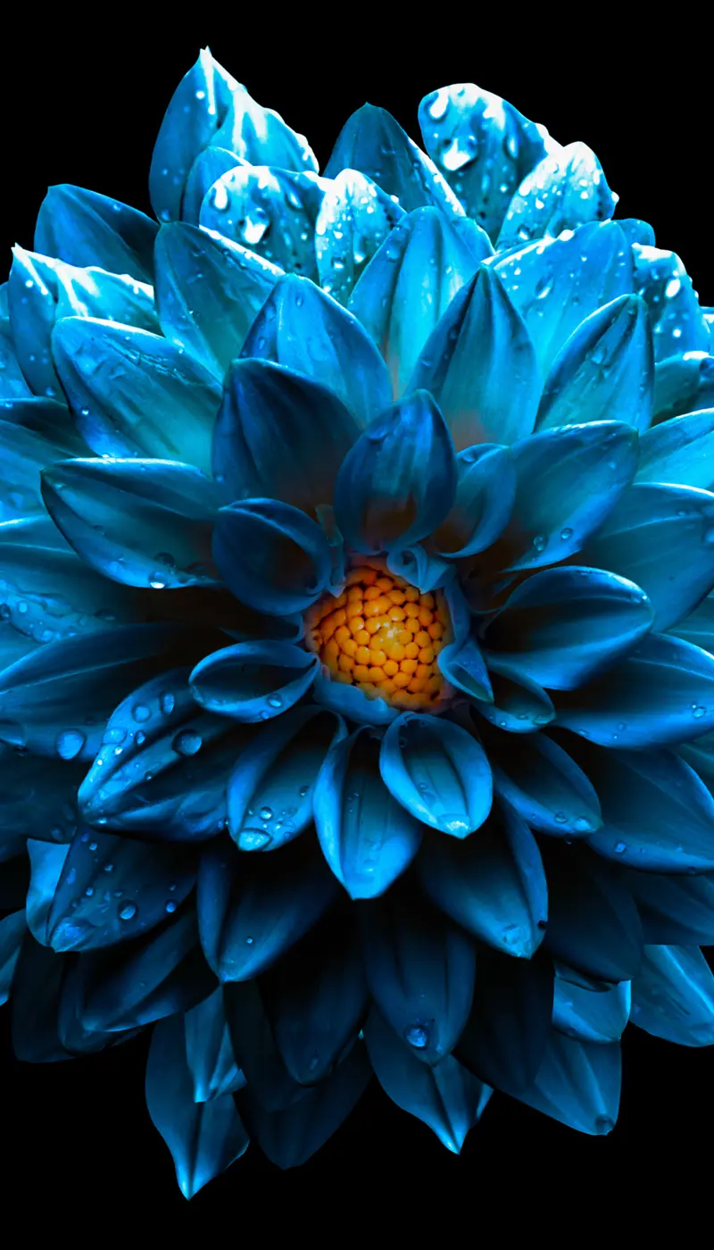 surreal wet dark chrome sea blue flower dahlia macro isolated on black