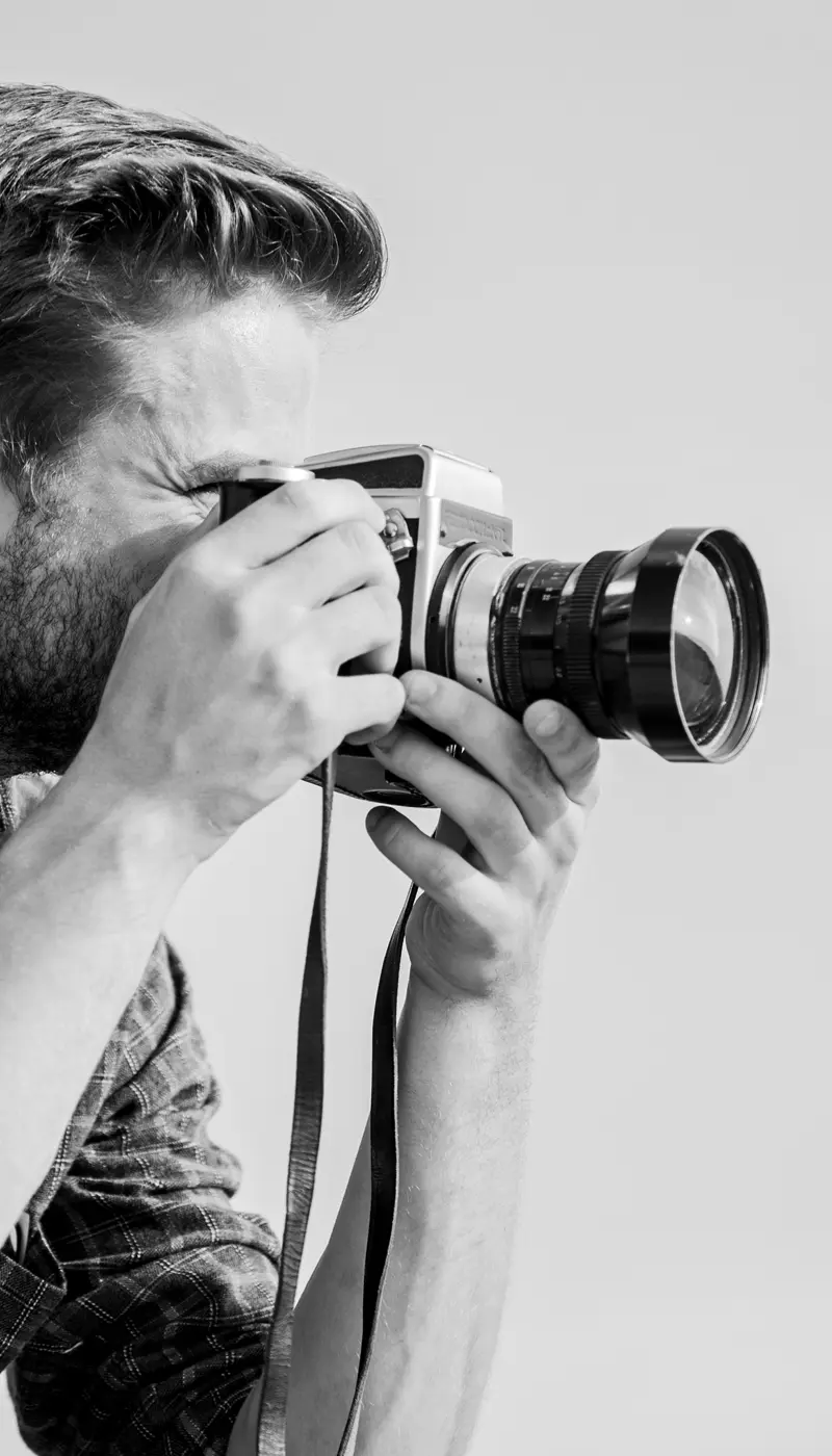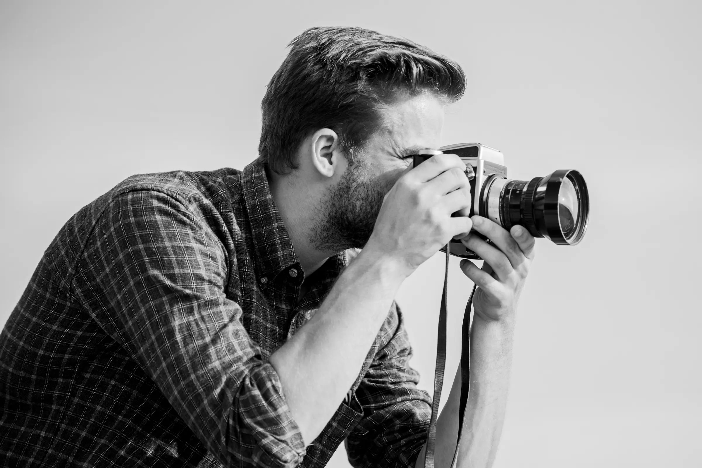 reporter taking photo hipster photographer blogger shooting vlog guy outdoors blue sky background handsome traveler retro camera