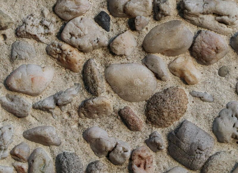 The texture of large and smooth pebbles. The texture of large and smooth pebbles sticking out from a cement background, close-up.