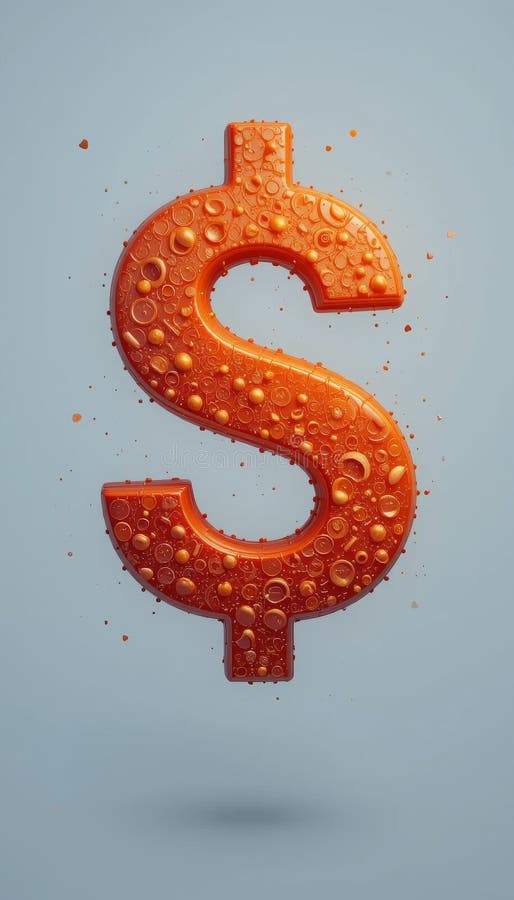 Textured Orange Dollar Sign Against a Clean Background. A vibrant, three-dimensional orange dollar sign, covered in small, bubble-like textures and tiny particles, against a light blue-grey background. AI generated
