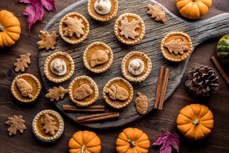 Top down view of various delicious decorated pumpkin pie tarts surrounded by fall decorations.