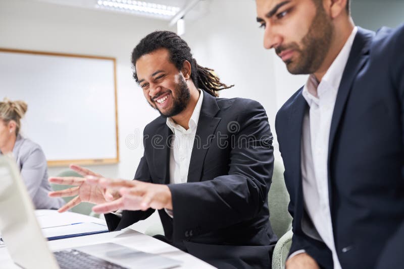 Two business people at the laptop computer in the IT workshop. Two business people at the laptop computer work together as a team in the IT workshop in the office