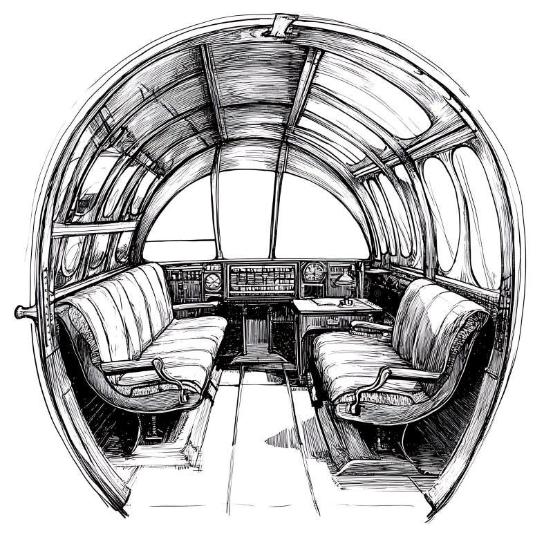 Vintage airplane cockpit interior sketch ink sketch