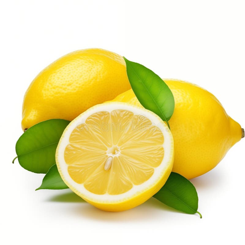 Whole And Half Lemons With Leaves On White Background. Whole and half lemons with leaves, set against a white background. The bright yellow citrus and fresh green leaves create a vibrant and refreshing visual contrast. AI generated