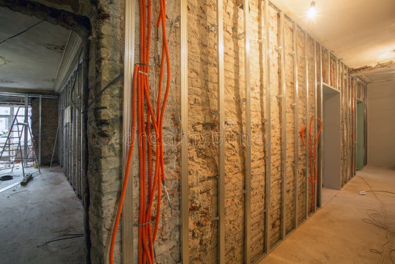 Working process of install of frames for plasterboard and corrugated pipe with electrical cables in an apartment is under construction, overhaul, remodeling, rebuilding, home improvements, reconstruction and renovation